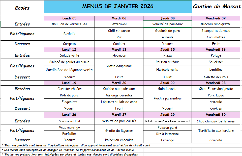 Le service cantine est assuré les jours d’école. Les repas sont préparés par l’association Casta à Massat et servis dans la nouvelle cantine jouxtant l’école. Les repas sont bio et préparés avec des produits locaux.